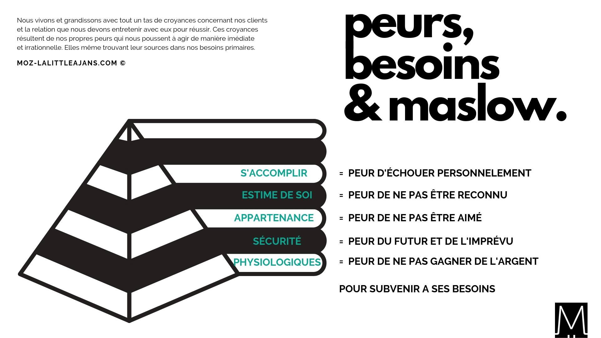Toutes ces peurs trouvent leurs origines dans nos besoins primaires, établis par Maslow.